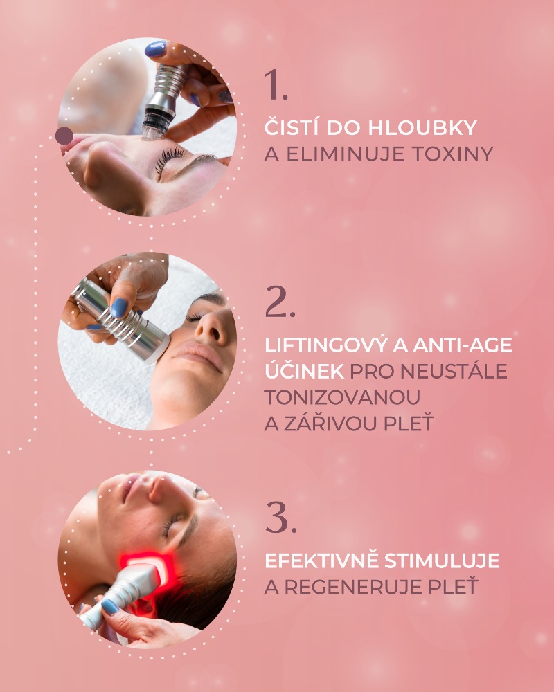 - Světelná terapie (LED), která stimuluje přirozenou regeneraci pleti